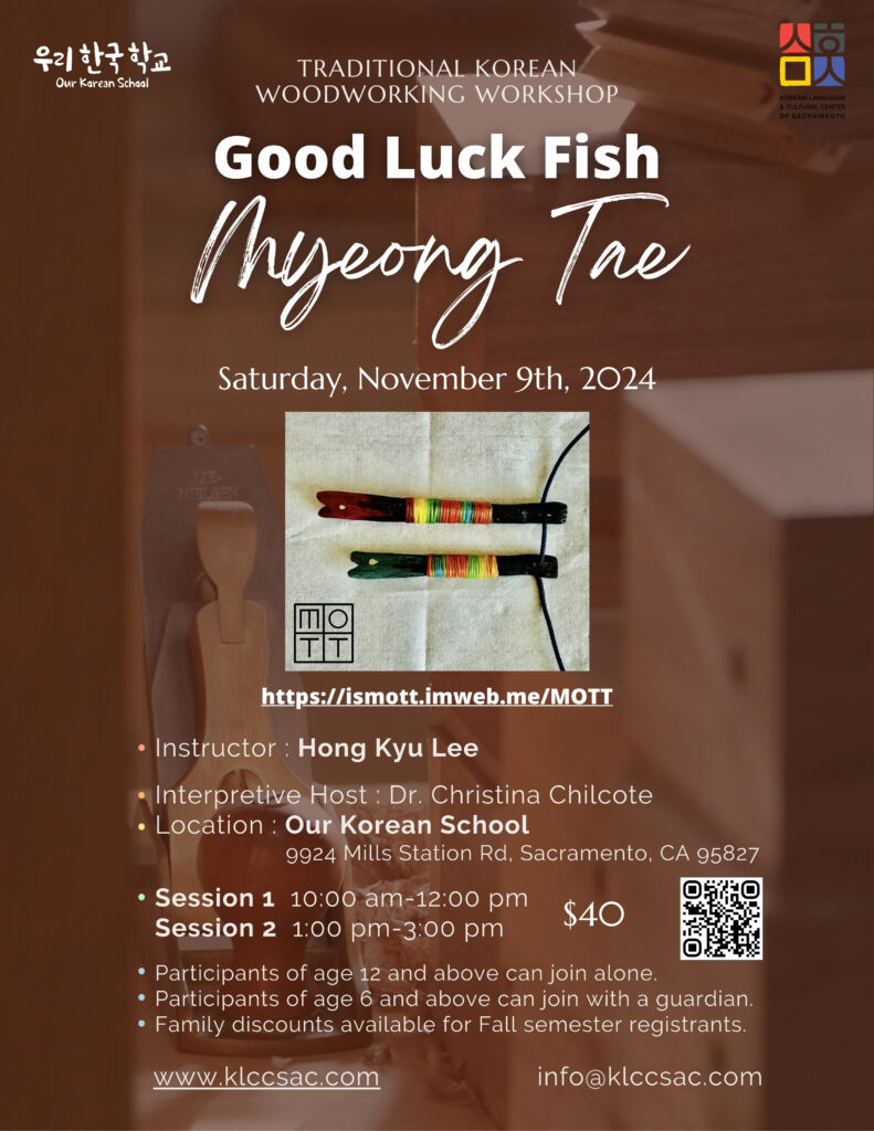 KLCCSac is offering a traditional Korean woodworking workshop. You will learn about the meaning and use of the good luck fish myungtae and have the opportunity to make one yourself. If you submit the registration form at the link below, we will send you a confirmation email after review. Children aged 6 and above can participate with a guardian.